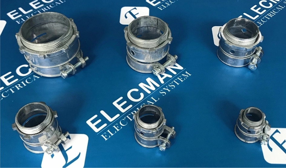 ELECMAN® Zinc squeeze connectors straight flexible conduit to box type are used to connect flexible metal conduit and steel armored cable to a box or enclosure in dry locations.